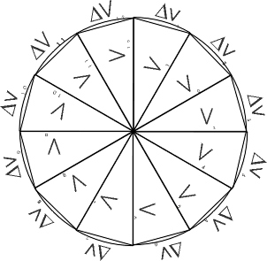 Traccia poi le variazioni di velocità corrispondenti a una rivoluzione completa. La somma dei loro valori è uguale alla somma dei lati del poligono rappresentato. In realtà la direzione cambia costantemente e l’approssimazione sarà tanto maggiore quanto più piccolo è l’angolo del triangolo che noi scegliamo. Più i lati del poligono sono corti, più quest’ultimo si confonde con una circonferenza di raggio v.