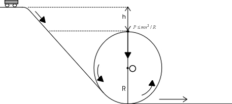 La condizione è che la forza centripeta mv2/R, con cui la pista trattiene l’acrobata che viaggia alla velocità v, sia maggiore o uguale al peso dell’acrobata più veicolo. Poniamo quindi la condizione minima mv2/R=mg da cui v2=gR. Applichiamo il principio di conservazione dell’energia. |